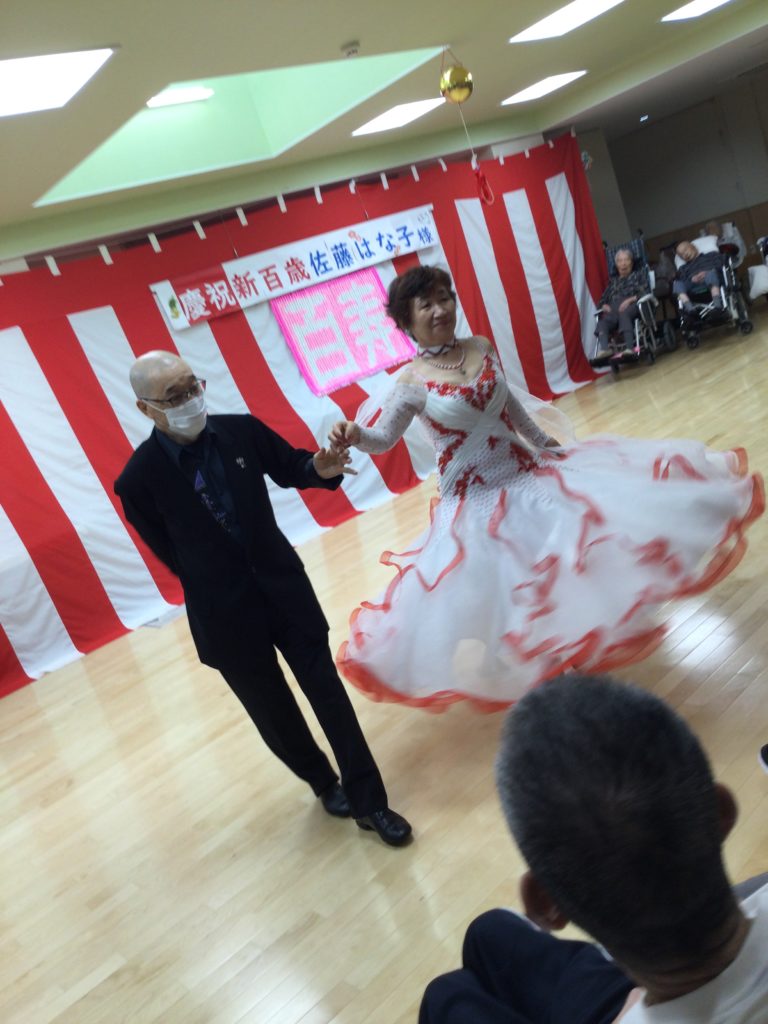 「敬老の日」に、山梨市長・山梨市議会副議長・山梨市社会福祉協議会会長が、新たに百歳になられる入居者様のお祝いに来られました。ちよ劇団(甲州市)の皆さんによる懐メロ歌唱と社交ダンスの披露もあり、会場全体でお祝いし心温まる時間となりました。